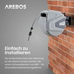 Die Schlauchbox von AREBOS besitzt eine Schnellkupplung und einen praktischen Schlauchanschluss 1/2. Führen Sie Ihre Arbeiten einfach & bequem mit AREBOS.Schwenkbare Wandhalterung