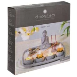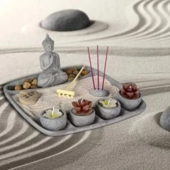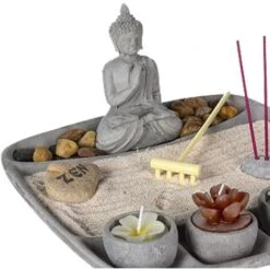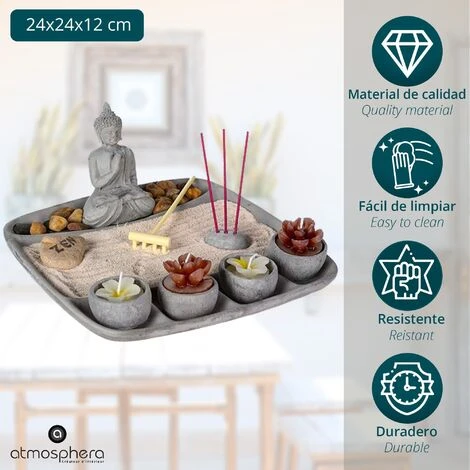 Wie im Bild zu sehen; Das Set enthält: Tablett 23.4×23.2 / Buddha: H. 10.8 x l 7 x l. 4 cm / Rake 12,7×3.7 / 4 Halterschalen: Durchmesser 5,2 x bis 3,2 cm