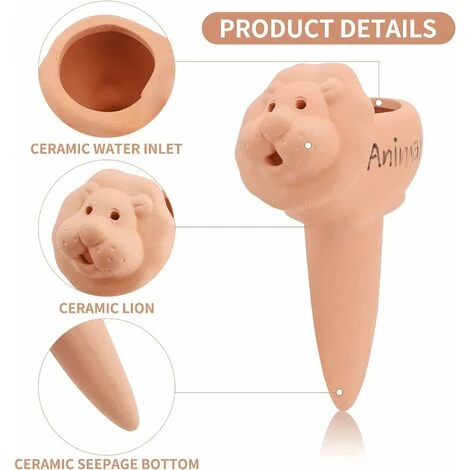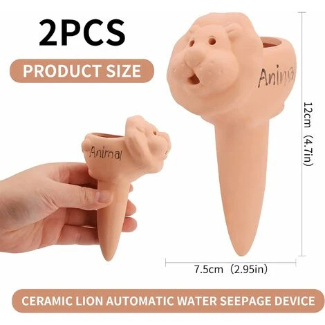 2 Stück Pflanzenbewässerungsstäbe, Keramikbewässerungsspitzen Pflanzenbewässerer Gartenbewässerer Tropfbewässerungsgerät Tropfautomatisches Bewässerungsgerät Urlaubsbewässerungssystem für Innen- und AußenpflanzenEigenschaften: – Dekorativ: Der Pflanzenbewässerer kann die Pflanzen nicht nur bewässern, sondern auch ein nettes Feature hinzufügen ein Haus oder ein ein Garten. – Breite Anwendung: zu außer Zimmerpflanzen, Gärten, Hängepflanzen, Blumen, Gewürze, Kräuter, Topfpflanzen oder Terrassenpflanzen sind ebenfalls geeignet. – Angemessene Größe: Perfekte Größe, um direkt an die Wurzeln zu gießen und einen zu schnellen Wasserverlust wirksam zu verhindern. Gesünder als Oberflächenpflanzen einweichen. – Einfach zu verwenden. Verwendung: Füllen Sie das Gerät einfach mit Wasser und stecken Sie es in den Blumentopf oder die Erde. Spezifikation: Material: Keramik Größe: wie auf den Bildern gezeigt Form: Löwe und Kätzchen Lieferumfang: 2 x automatisches Wassergerät Warmer Hinweis: 1, Aufgrund des unterschiedlichen Monitors und Lichteffekts , die tatsächliche Farbe kann leicht von der Farbe des Bildes abweichen.2, bitte erlauben Sie 2-3cm Abweichungen aufgrund der manuellen Messung.