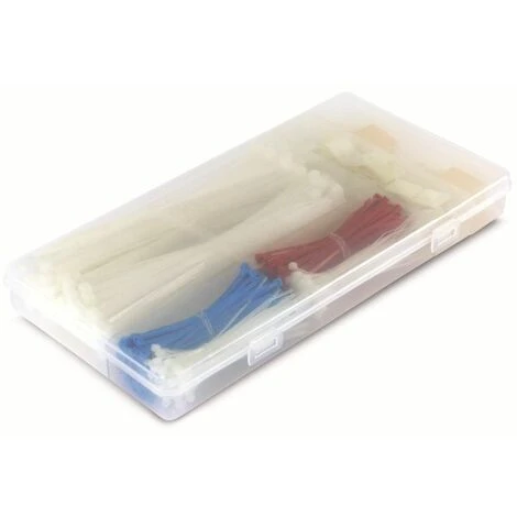 490-teiliges Set bestehend aus 150 Kabelbinder 190×4,7 mm weiß, 100 Kabelbinder 100×2,3 mm rot, 100 Kabelbinder 100×2,3 mm blau, 100 Kabelbinder 100×2,3 mm weiß, sowie 30 Montagesockel 18x18x4 mm und 10 Montagesockel 28x28x6 mm. Lieferung in stabiler Kunststoffbox.