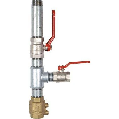 - Doppelter Pumpenstock 1.1/4 Mit Kugelhähnen und entlüftbarem Rückschlagventil, ermöglicht den gleichzeitigen Anschluss von Hand- und E-Pumpe, Rohrlänge 300 mm.