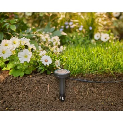 Der GARDENA Bodenfeuchtesensor misst zuverlässig die Bodenfeuchte genau da, wo es wichtig ist, an der Wurzel der Pflanzen. Sowohl im Rasen und Blumenbeeten als auch in weniger tiefen Blumentöpfen. Der Sensor ist mit der Bewässerungssteuerung über ein 5 m langes Kabel verbunden, welches bei Bedarf auf bis zu 105 m verlängert werden kann. Bei ausreichend Bodenfeuchte wird die nächste geplante Bewässerung übersprungen, um Wasser zu sparen. Der flache Sensor ragt nur 20 mm aus der Erde und kann so auch auf dem Rasen verbleiben auf dem ein Mähroboter im Einsatz ist, ohne Schaden zu nehmen.