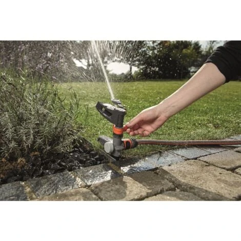 Der Gardena Premium Impuls-, Kreis- und Sektorenregner bewässert große Flächen mühelos. Er besteht aus einer robusten Metall- und Kunststoffkombination. Dadurch wird der Regnerkopf sehr stabil. An den Verstellringen stellen Sie einfach die zu bewässernden Sektoren feinstufig von 25° bis 360° ein. Der ausgewählte Sektor ist jederzeit durch diese Verstellringe gut erkennbar. Die Präzisions-Messingdüse unterstützt die genaue Ausbringung des Wassers. Mit Hilfe des großen, komfortablen Drehknopfes legen Sie die Wurfweite fest. Diese können Sie von 5 m bis maximal 12,5 m einstellen. Damit lässt sich eine Fläche von 75 m² bis maximal 490 m² beregnen. Das Anschlussgewinde um den Regnerkopf aufzuschrauben hat einen Durchmesser von 21 mm (G 1/2). Der Regner ist bereits auf einem Metallspike fixiert. Damit lässt sich der Gardena Premium Impuls-, Kreis- und Sektorenregner einfach im Rasen befestigen. Genauso einfach lässt er sich entfernen und an einer anderen Stelle platzieren. Der Regner ist mit dem Gardena Systemanschluss und der Endkappe anschlussfertig ausgestattet. Dadurch können Sie ihn sofort einsetzen. Mit Hilfe des Gardena Hahnstücks (Art. -Nr. 901) können mehrere Regner hintereinander angeschlossen werden. Somit können große Flächen leicht beregnet werden.