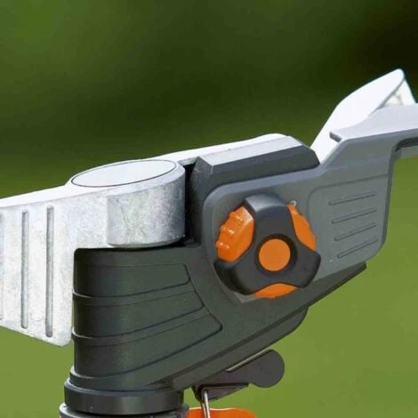 - Großer Drehgriff mit Weichkunststoff-Elementen für komfortable, stufenlose Einstellung der Wurfweite von 5-max. 12,5 m