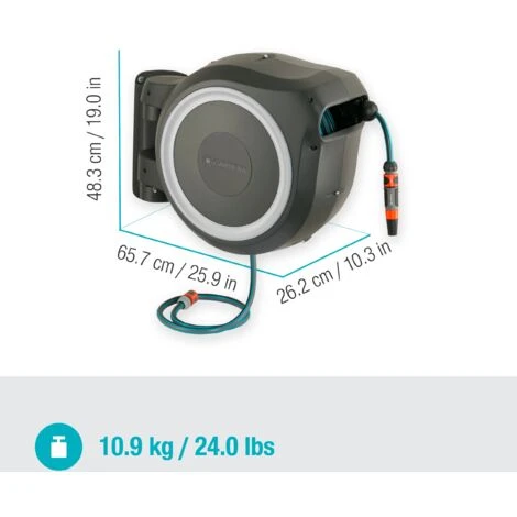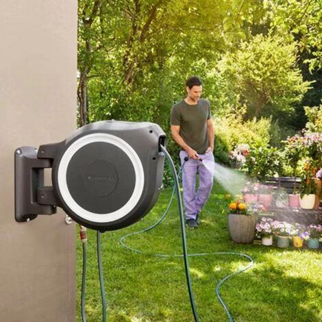 Dank der innovativen Konstruktion und der praktischen Aufrolltechnologie der Wand-Schlauchbox RollUp M/L sind mühseliges Kurbeln und ein verknickter Schlauch bei der Gartenbewässerung Vergangenheit. Die Wand-Schlauchbox erledigt das Schlauchaufrollen im Handumdrehen und bewahrt den Schlauch sicher und platzsparend auf. Dafür wird die Box mit einer um 180° schwenkbaren Halterung an einer Hauswand befestigt. Durch das bewegliche Gelenk werden maximale Bewegungsfreiheit und ein großer Handlungsspielraum bei der Bewässerung geboten. Zudem ist jeder Winkel des Gartens mit dem 25 Meter langen Qualitätsschlauch zu erreichen. Der Schlauch wird durch Ziehen mühelos abgerollt und rastet dank besonders kurzer Arretierungsstops automatisch an der gewünschten Länge ein. Durch ein leichtes Ziehen wird die Befestigung wieder gelöst und eine integrierte Feder holt den Schlauch automatisch und zuverlässig wieder ein. Damit der Schlauch sicher und kontrolliert eingezogen wird, hat die Wand-Schlauchbox eine innovative RollControl-Technologie. Die integrierte Schlauchführung sorgt für eine ordentliche und gleichmäßige Aufwicklung, sodass keine Knicke oder Knoten im Schlauch entstehen. An der Wandhalterung befindet sich unter anderem Platz für mehrere Bewässerungsaufsätze, die dort platzsparend aufbewahrt werden können. Das hochwertige Material wird sowohl von einem UV- als auch Frostschutz geschützt. Zusätzlich ist die Box mit einem Diebstahlschutz ausgestattet. Neben der Wand-Schlauchbox sind die Wandhalterung, ein Anschlussschlauch, alle benötigten Original GARDENA System- und Montageteile sowie eine Spritze mit zwei verschiedenen Sprühstrahloptionen enthalten. Auf die Wand-Schlauchbox RollUp M/L gibt GARDENA 5 Jahre Garantie.