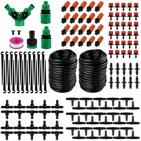 [Ein Set enthält alles] Das Bewässerungssystem-Set enthält 50-teiliges Rohr, Pfähle, verstellbares Sprühgerät und Tropfer sowie alle Arten von Anschlüssen , Spitzen und Teflonband. Ermöglicht es Ihnen, mehrere Pflanzen gleichzeitig zu bewässern. [Bewässerungsanpassung] Jede Düse kann individuell eingestellt werden, sie kann den Wasserbedarf verschiedener Pflanzen gleichzeitig decken.