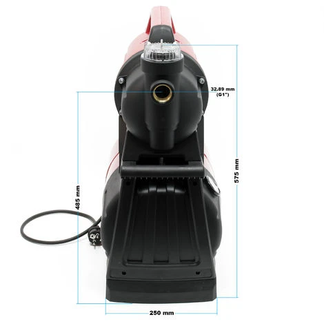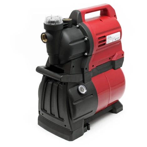 Das Hauswasserwerk hat eine Leistung von 1300 Watt und eine maximalen Förderhöhe von 48 Metern (max. 4,8 bar), wodurch sich bis zu 4500 Liter Klarwasser pro Stunde fördern lassen. Der Druckbehälter hat ein Fassungsvermögen von 19 Litern und ist aus schlagfestem Kunststoff gefertigt, was ihn besonders stabil und langlebig macht. Der praktische Tragegriff an der Geräteoberseite bietet zudem einen einfachen Transport. Die Pumpe eignet sich daher ideal für den mobilen Einsatz, denn auch zur Einstellung der Wassereinlass- bzw. Wasserablassschraube wird keinerlei Werkzeug benötigt. Das eingebaute Manometer ermöglicht zudem eine genaue Überprüfung des Arbeitsdrucks.