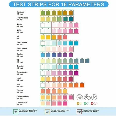 Neue 16 in 1 Teststreifen: Unser Testkit testet die folgenden Tests: Gesamtalkalität – pH – Härte – Blei – Eisen – Chrom / CR (VI) – Brom – Nitrat – Fluorid – VC – Calcium – freies Chlor – Gesamt Chlor – Wurzelkarbonat – Cyanursäure