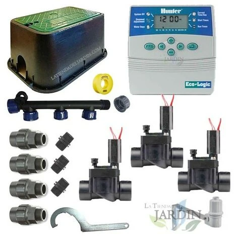- Automatisches Bewässerungsset für die Bewässerung mit folgendem Material: Hunter ECO LOGIC-Steuergerät 4 Innenzonen, 3 PGV100 1 24-V-Magnetventile, 12 Meter 12 mm Teflon, 4 32 mm PE-Außengewindeverbindungen, Regensensor, 3-Zonen-Bewässerungsverteiler, Stahl Schraubenschlüssel zum Festziehen und Box 49x35x22 cm.