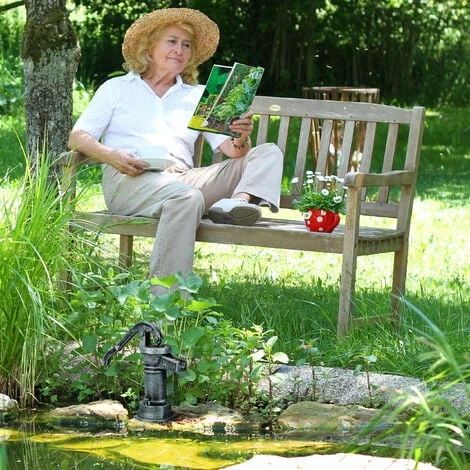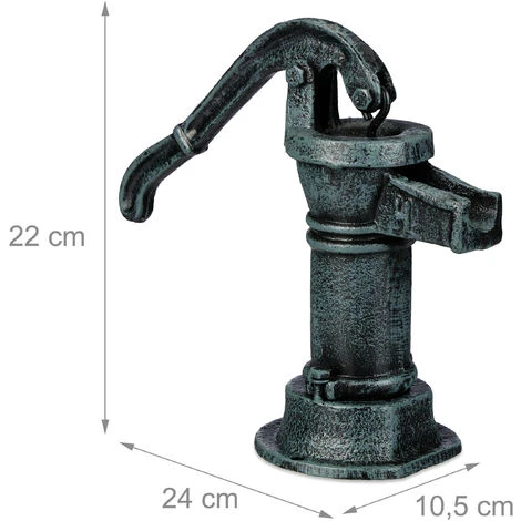 Mit dieser Deko Pumpe im Mini-Format bereicherst Du Deinen Garten um einen rustikalen Hingucker. Die Gusseisen Deko im Antik-Design ist einer klassischen Schwengelpumpe nachempfunden und besticht mit Ihrer Treue zum Original: Sogar der Hebel lässt sich bewegen. Platziere die Gartenpumpe zu Dekozwecken am Gartenteich oder wo immer Du willst und trage nostalgisches Flair in Dein grünes Reich. Auch eine Bodenmontage ist möglich, denn die Hebelpumpe ist am Sockel mit Bohrlöchern ausgestattet.