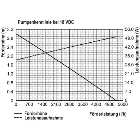 - Förderleistung: Max. 5000 l/h, bei 0 m Förderhöhe (Kennlinie siehe Bilder)