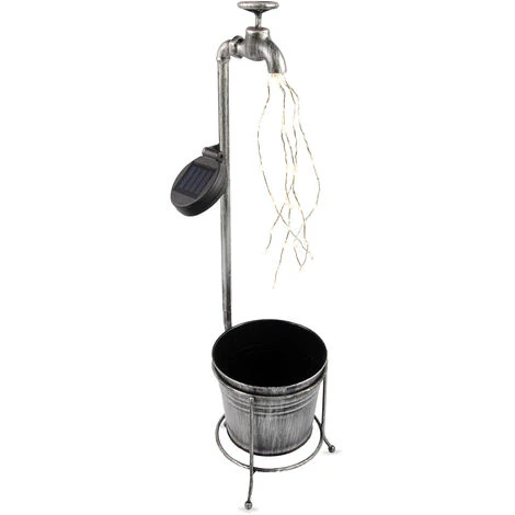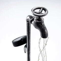 Dieser Wasserhahn auf einem schlichten Stahlrohr ist bei Tage durch seine Verzinkung im Used-Look ein romantisches Vintage-Accessoires, aber wenn die Dämmerung über den Garten hereinbricht, offenbart er einen besonderen Überraschungseffekt: Denn dann beginnen fünf LED-Lichterfäden, die aus dem Hahn fließen, ihr bezauberndes Lichterspiel und rieseln wie leuchtende Wassertropfen nach unten.