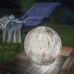 Die Solarkugel aus hochwertigem Kunstharz gepaart mit Sandsteinpuder, lässt tagsüber der Fantasie keine Grenzen offen. Für den einen wirkt Sie wie ein Naturstein, der sich hervorragend in Ihre bestehende Gartenlandschaft integrieren lässt. Einen anderen mag Sie auf eine Safari mitnehmen und an den Rücken eines Zebras erinnern. Lassen Sie sich ein auf eine Reise in die Natur oder in die wunderbaren Welten Afrikas. Egal ob einfacher oder exotisch angehauchter Garten der »Ribbed-Ball« ist in jedem Fall ein Highlight. Auch bei Nacht beeindruckt die Solarkugel mit ihrer natürlichen Schönheit und erstrahlt in ihrem schönsten Licht.