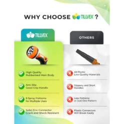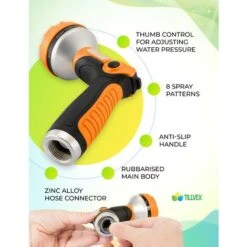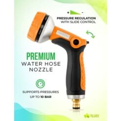 Der Multifunktions-Sprühkopf mit 10 Funktionen (8 Sprüheinstellungen, Druckregulierung min/max, Feststellfunktion für Sprühtaster) verfügt über einen ergonomisch optimierten Handgriff und wurde für perfekten Halt mit Gummi überzogen.
