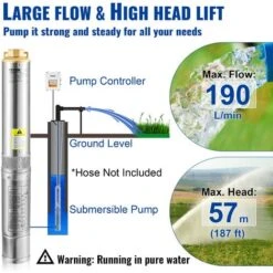- · Verbesserter Pumpenfluss & -kopf: Leistung: 1100 W, 230 V; Sandbeständig: < 5 %; Durchmesser: 10,2 cm (für Brunnengehäuse von 10,2 cm oder größer); Auslass: 5,1 cm NPT. Diese Tauchpumpe für Tiefbrunnen ist mit 9-stufigen thermoplastischen Laufrädern ausgestattet, die einen maximalen Durchfluss von 190 L/min und eine maximale Förderhöhe von 57 m bieten. Es wird mit einem externen Steuerkasten und einem 20 m langen Stromkabel geliefert, was das Leben ohne moderne Sanitärinstallationen viel einfacher macht. Pumpen Sie Ihre Sorgen mit Leichtigkeit ab und entspannen Sie sich. Keine Herausforderung ist Ihnen zu groß.