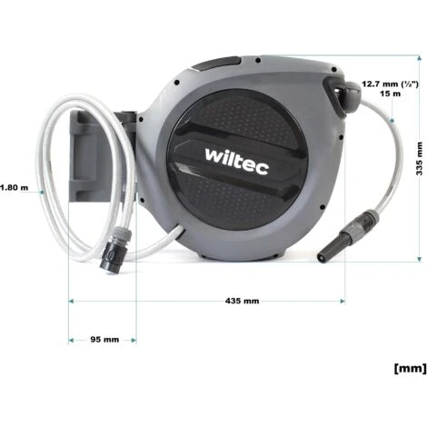 Die Wandhalterung ist um 180° schwenkbar, so dass die Schlauchbox bei Nichtgebrauch platzsparend an die Wand geklappt werden kann. Außerdem kann der Schlauch in einem großen Radius zum Bewässern eingesetzt werden. Die mitgelieferte Schlauchspritze verfügt über zwei verschiedene Sprühstrahloptionen.