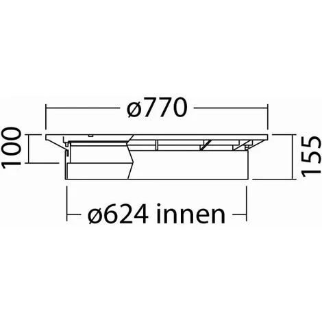 - PE-Abdeckung mit Rahmen begehbar bis max. 200kg nach DIN 1989, Abmessung: (Ø x H): Ø770 mm x 155 mm (wirksame Höhe 100mm), kindersicher, UV-beständig